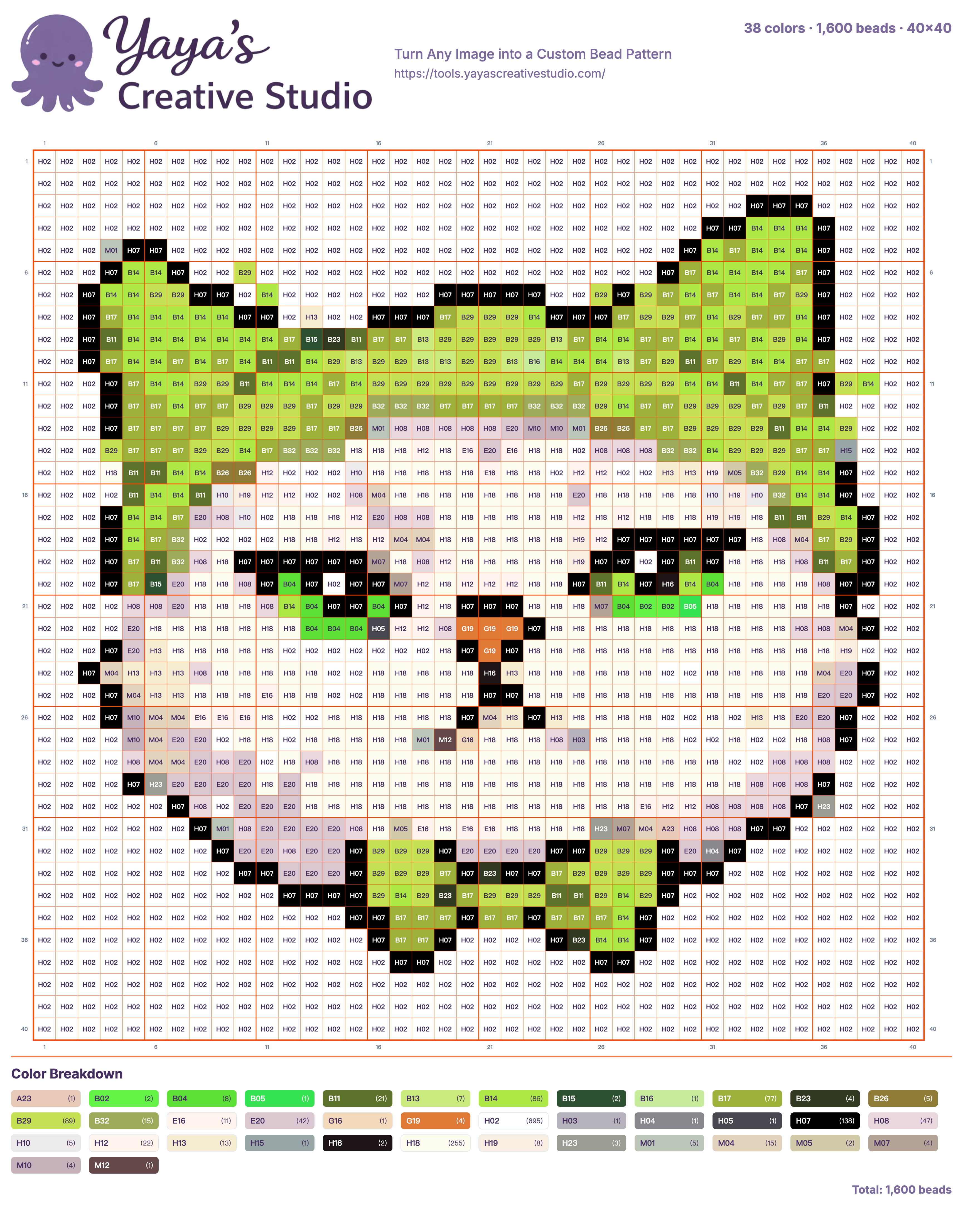 A vibrant pixel art fuse bead pattern featuring an adorable stylised cat face with bold green accents and expressive details. At 1,600 beads across 38 colors on a 40×40 grid, this cute cat perler bead pattern is fully compatible with Artkal and MARD mini bead palettes.