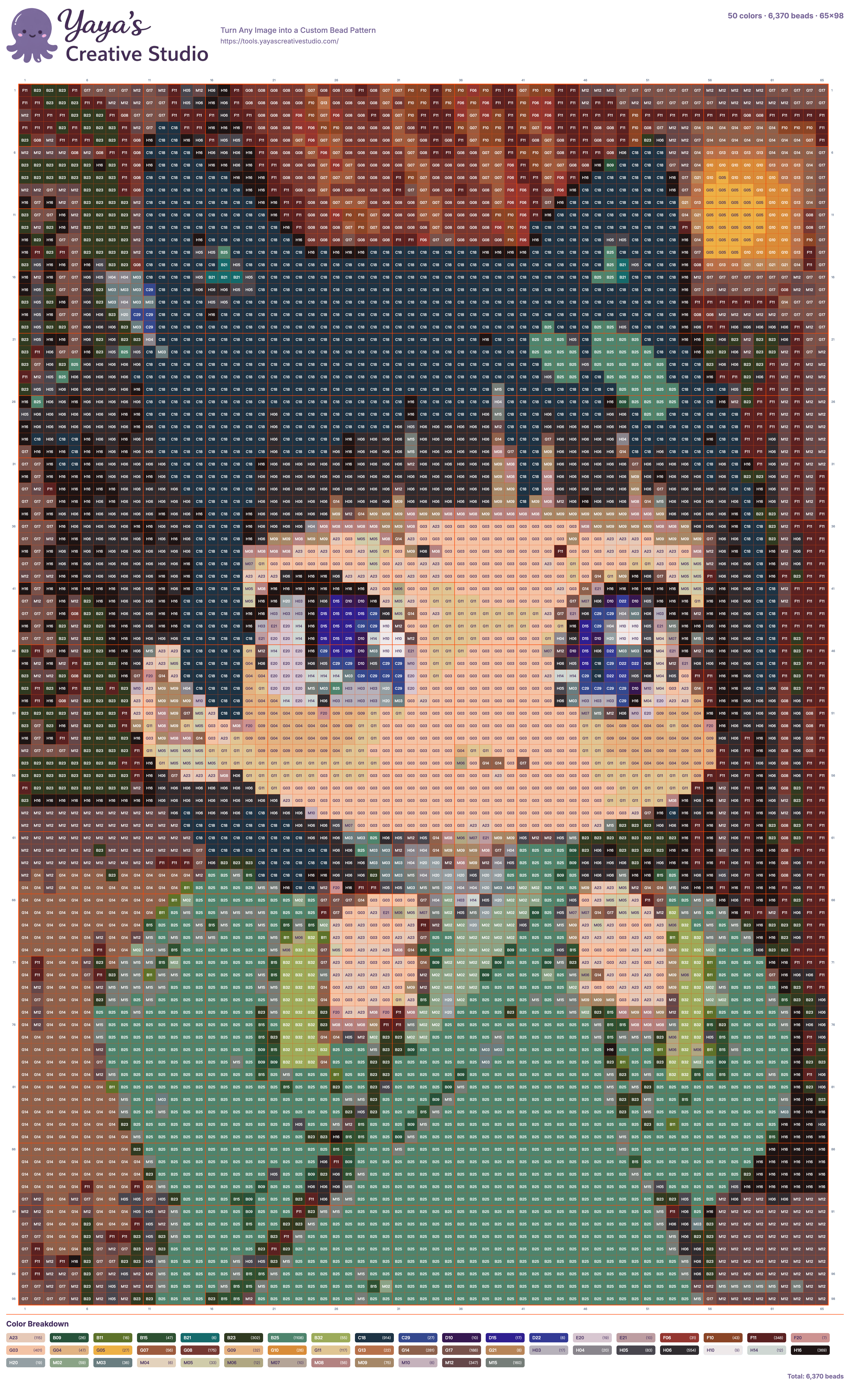 A beautifully crafted pixel art fuse bead pattern featuring Maomao from The Apothecary Diaries wearing her signature green kimono, with expressive big blue eyes. At 6,370 beads across 50 colors, this Maomao perler bead pattern is fully compatible with Artkal and MARD mini bead palettes.