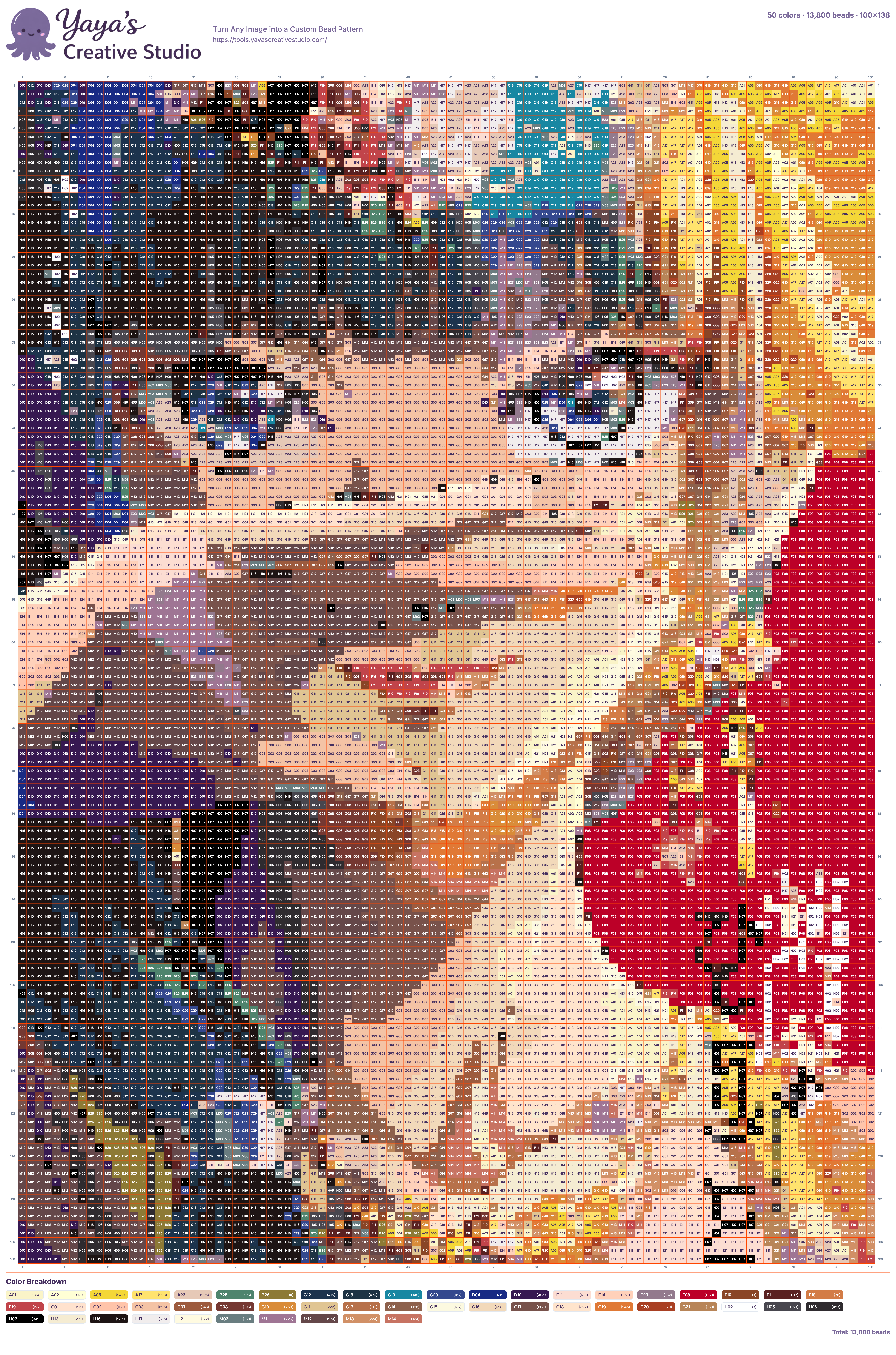 A stunning large-format pixel art fuse bead pattern of Maomao from The Apothecary Diaries, rendered in vivid anime style with vibrant colors and intricate details. At 13,800 beads across 50 colors, this detailed Maomao perler bead pattern is fully compatible with Artkal and MARD mini bead palettes.