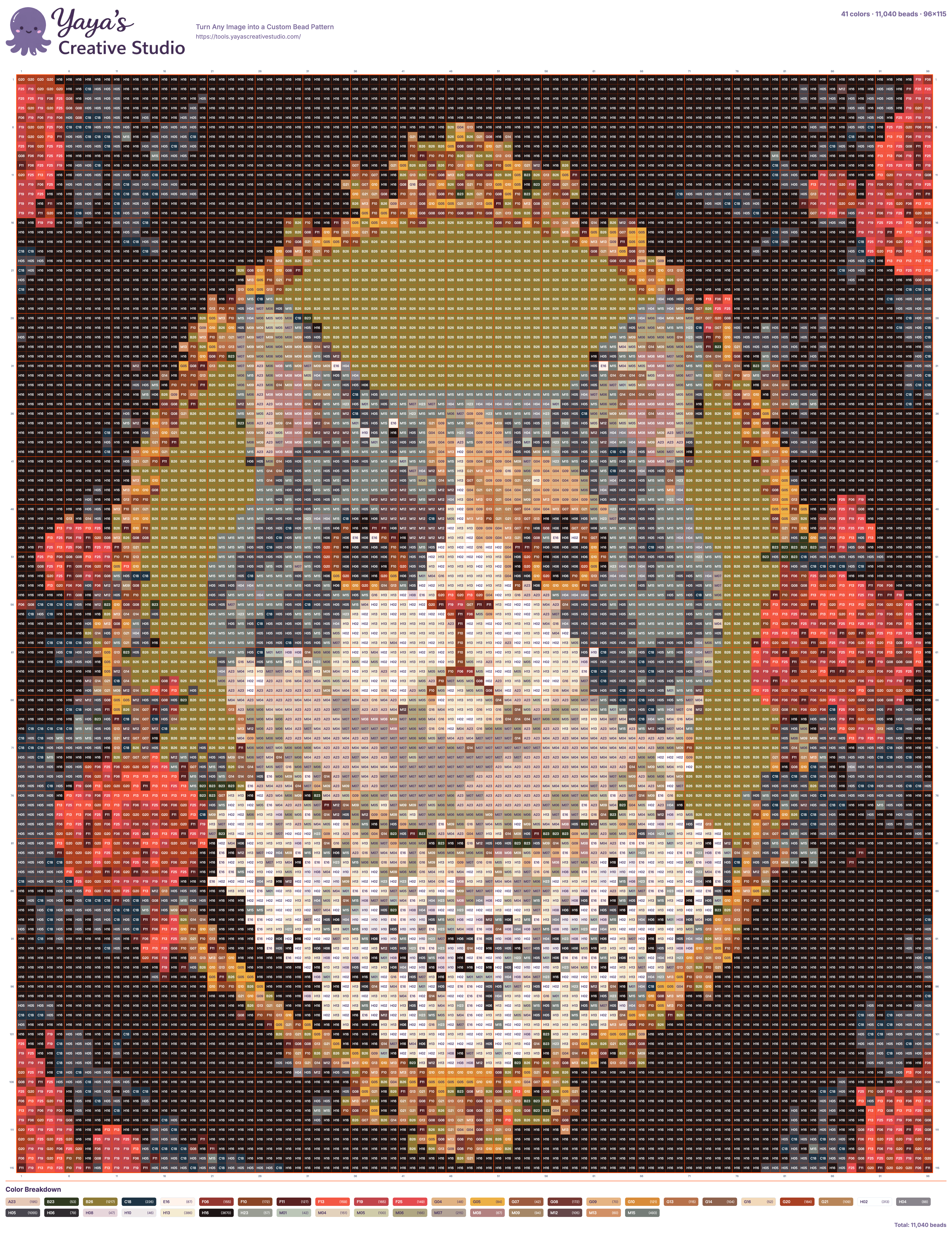 An elegant pixel art fuse bead pattern depicting a regal cat portrait set inside an ornate golden oval frame, surrounded by red roses — evoking a classic Renaissance painting style. At 11,040 beads across 41 colors, this vintage cat perler bead pattern is fully compatible with Artkal and MARD mini bead palettes.